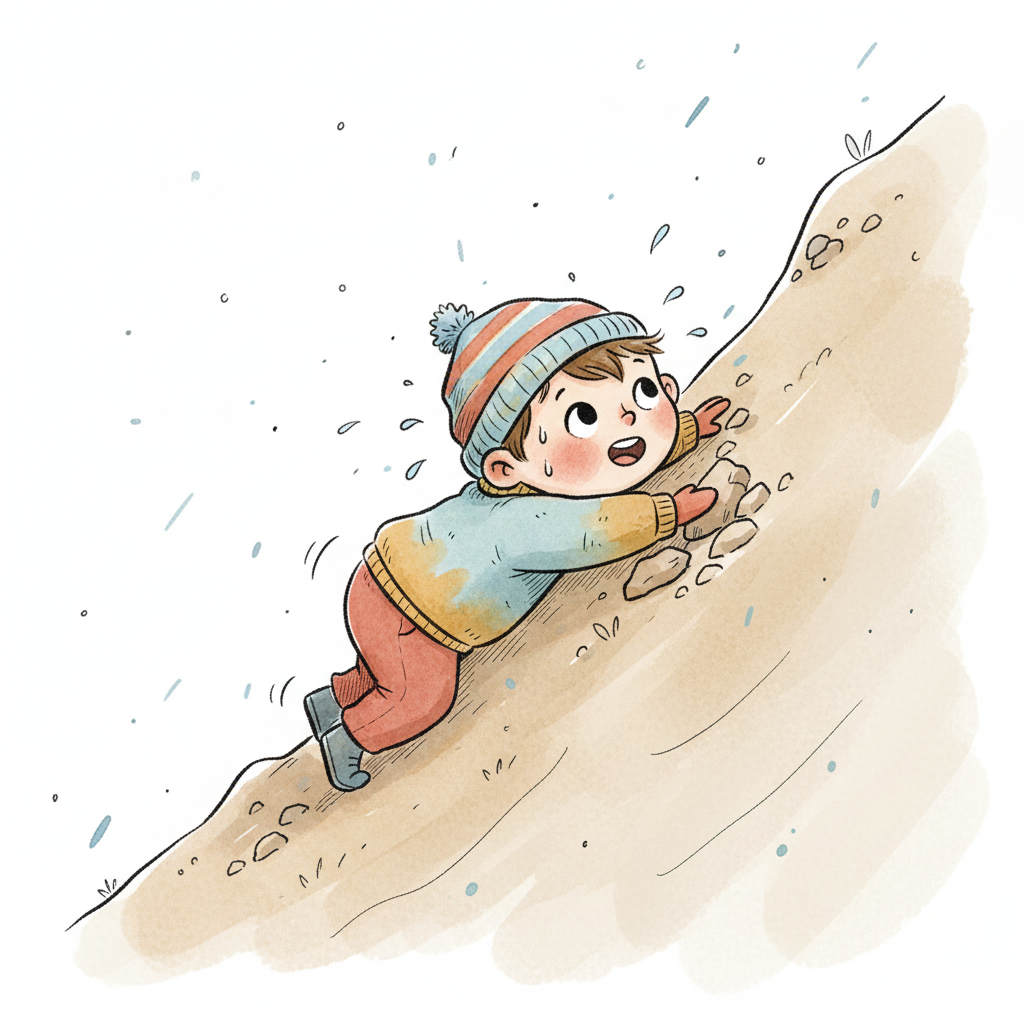 Kleines Kind mit Mütze klettert schwitzend einen steilen Erdhügel hoch, blickt nach oben.