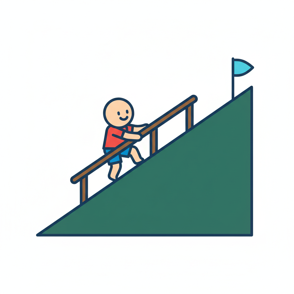 Cartoonfigur klettert lächelnd einen grünen Hang mit Geländer hinauf zu einer Flagge.