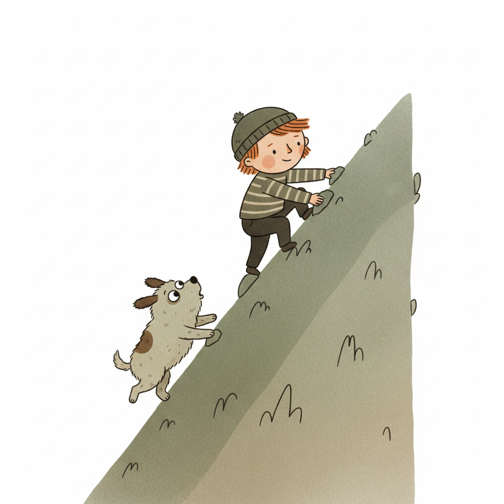 Ein Kind und ein Hund klettern einen grünen Hügel hinauf.