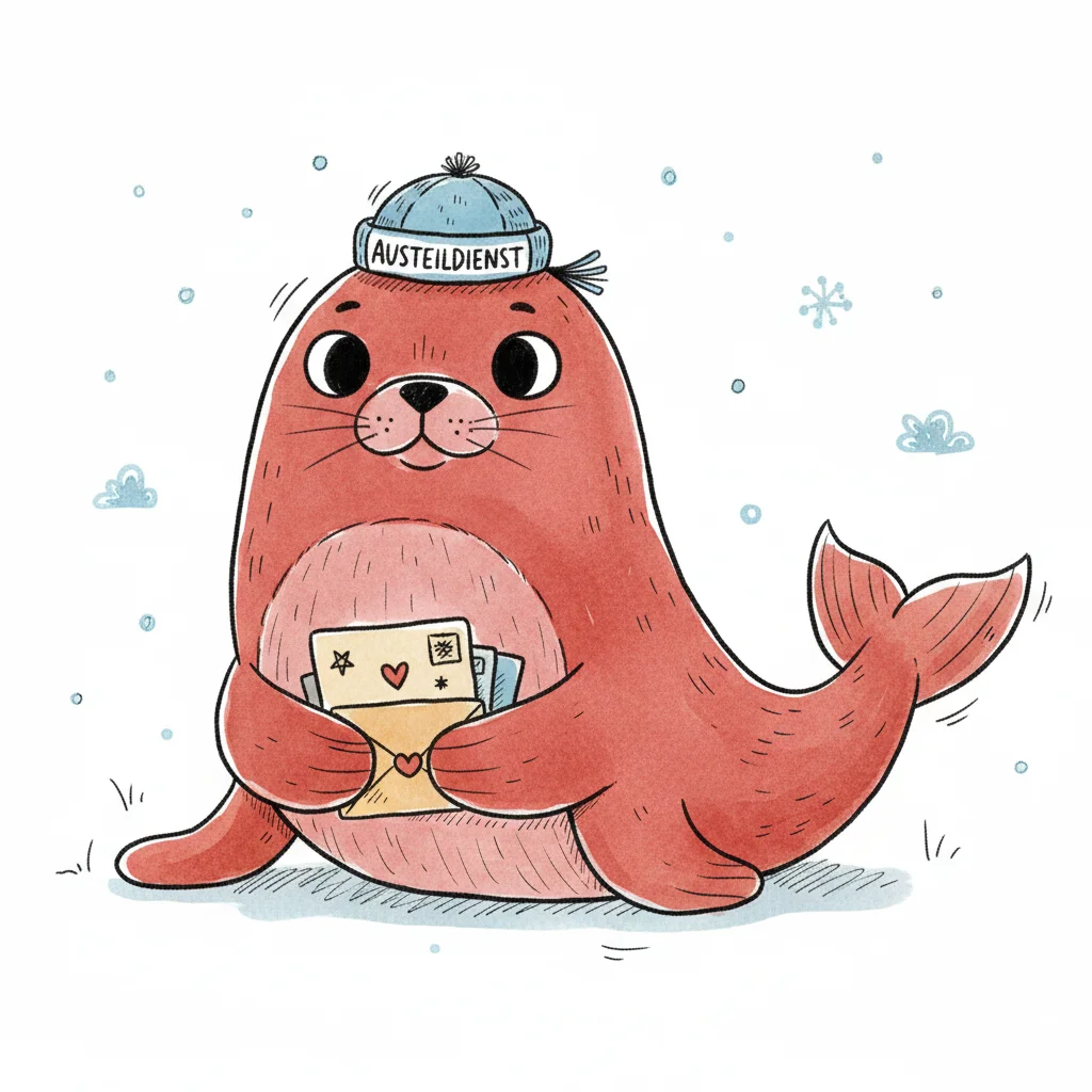 Fröhliche Robbe als Postbote mit Mütze und Briefen im Schnee.