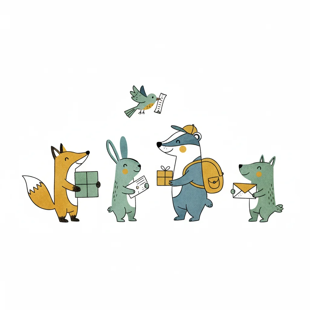 Niedliche Cartoon-Tiere (Dachs, Fuchs, Hase, Hund, Vogel) tauschen Geschenke und Briefe aus.