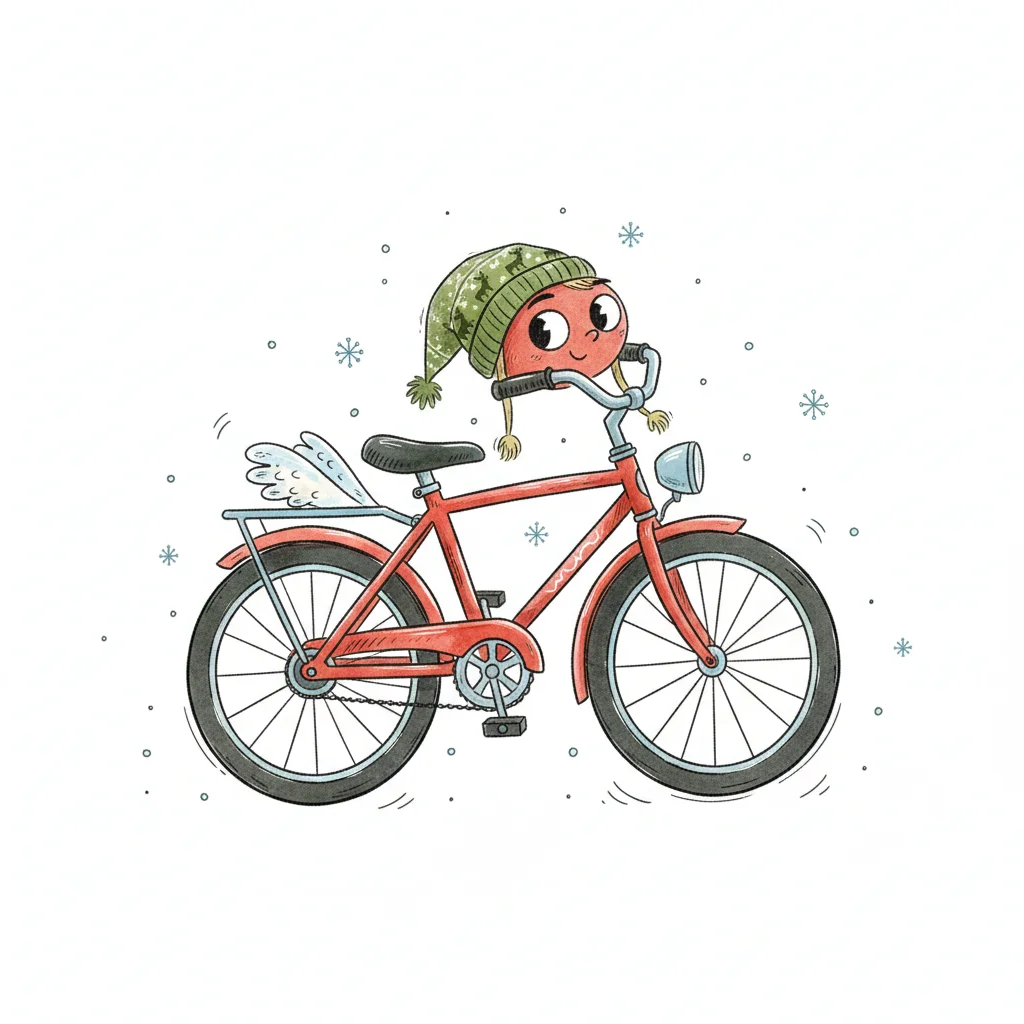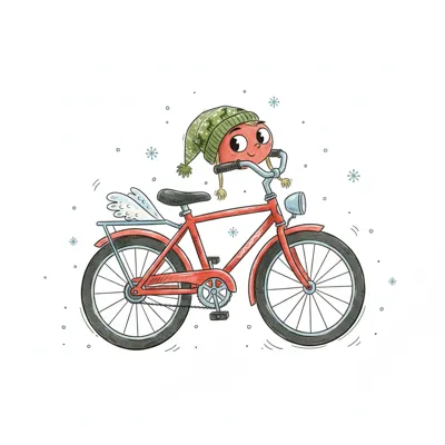 Niedliches rotes Fahrrad mit Apfel-Charakter in Wintermütze und Flügeln, umgeben von Schneeflocken.