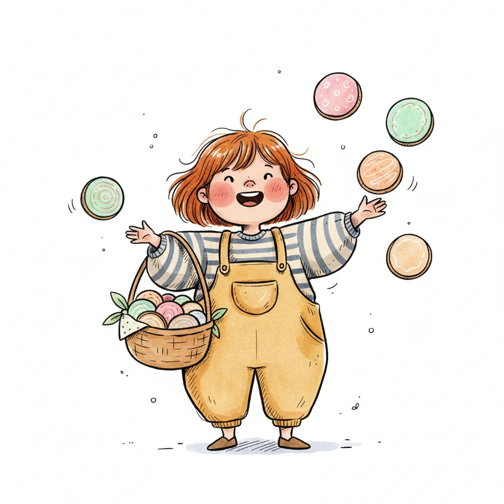 Fröhliches Mädchen mit Korb voller Eier, das bunte Scheiben jongliert.