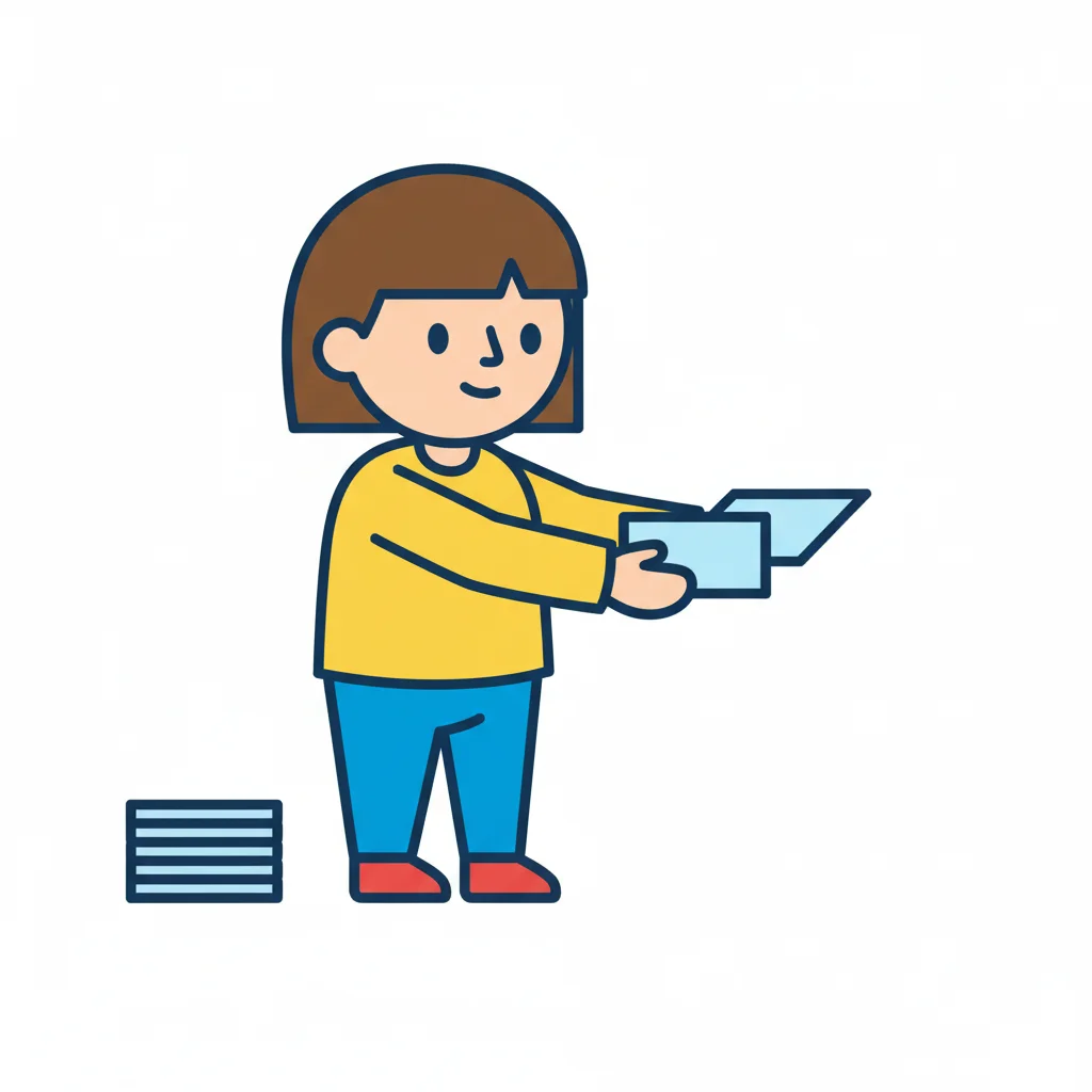 Stilisierte Person verteilt Karten oder Papiere, daneben ein Stapel. Freundlich lächelnd.