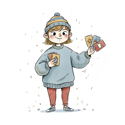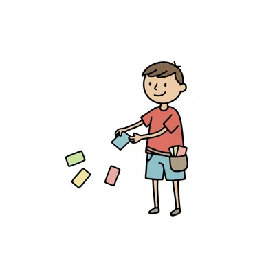 Ein lächelnder Cartoon-Junge wirft bunte Karten, weitere stecken in seiner Tasche.