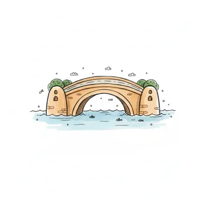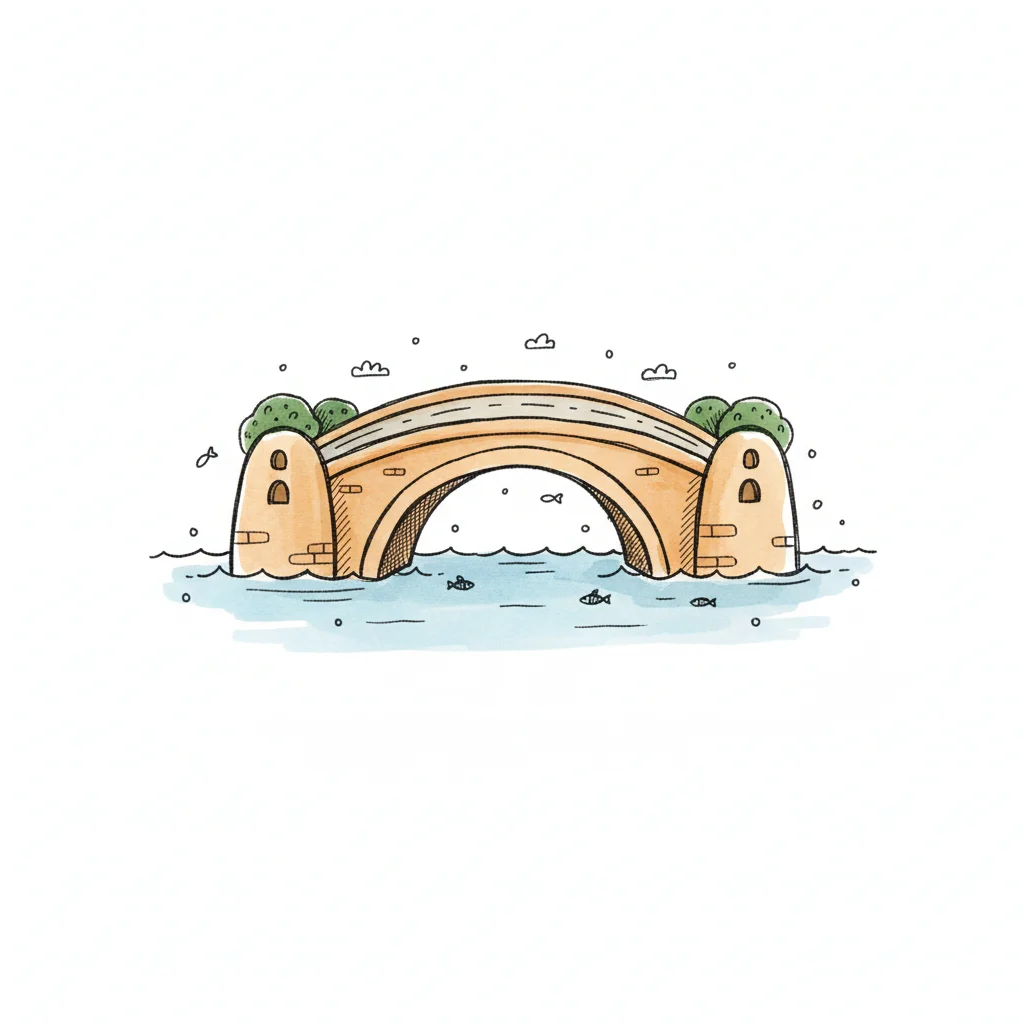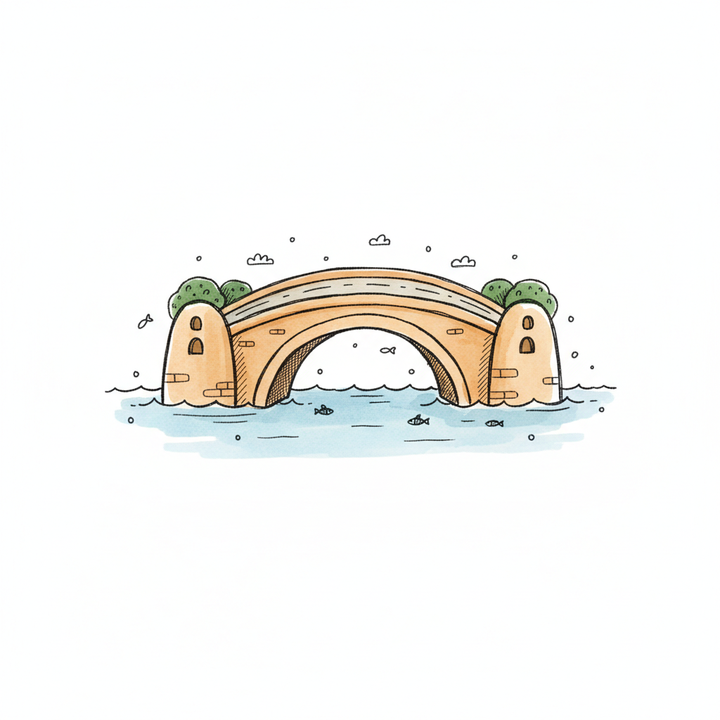 Illustrierte Steinbrücke mit drei Bögen über einem Fluss, umgeben von grünen Ufern und Bäumen.