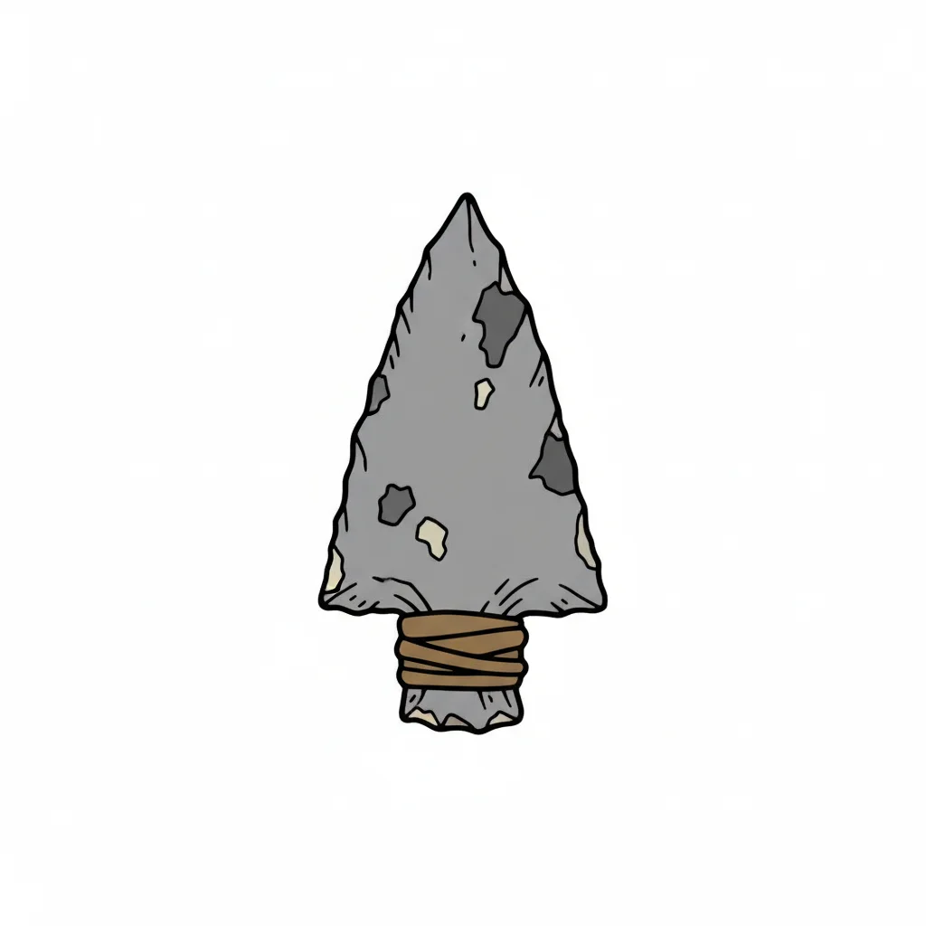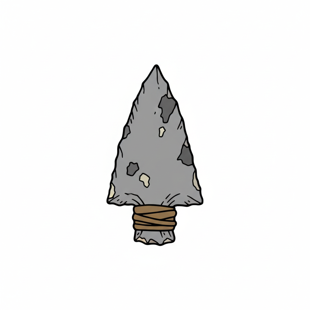 Gezeichnete graue Pfeilspitze aus Stein mit brauner Wicklung, isoliert auf weißem Hintergrund.