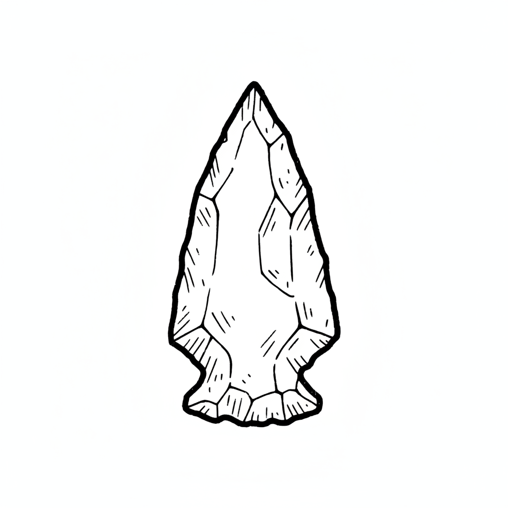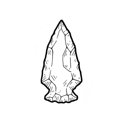Schwarz-weiße Illustration einer steinernen Pfeilspitze mit facettierter Oberfläche.