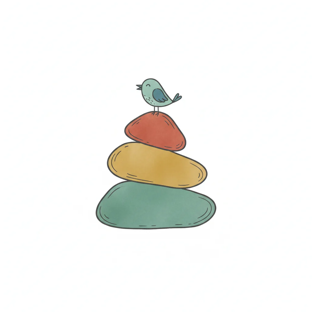Niedlicher Vogel sitzt auf einem Stapel bunter Steine in Aquarell-Optik.
