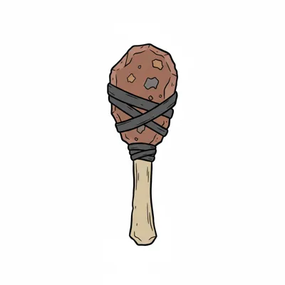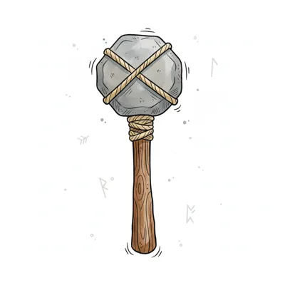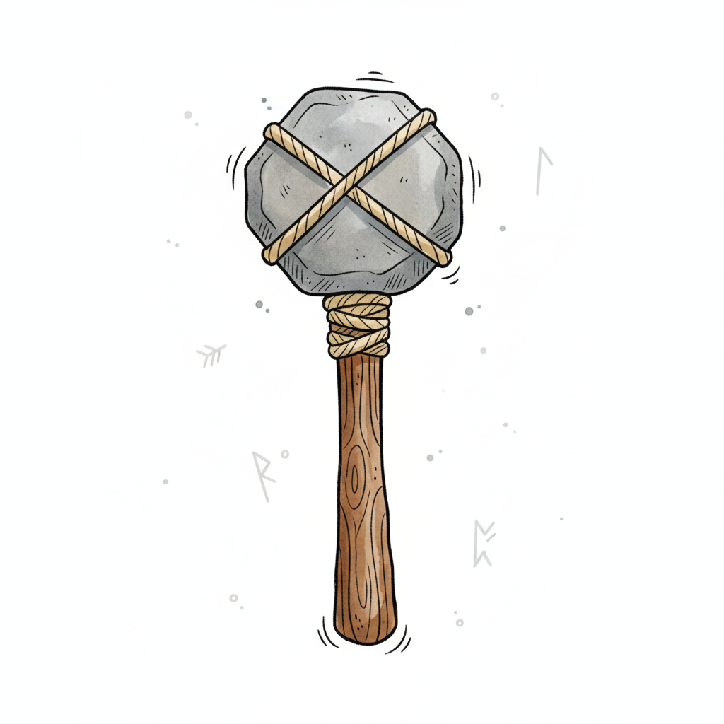Illustration eines prähistorischen Steinhammers mit Holzgriff und Seilbindung auf weißem Hintergrund.