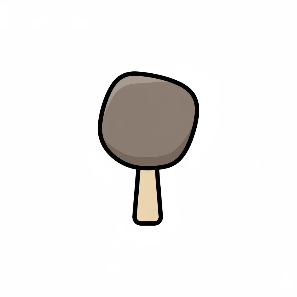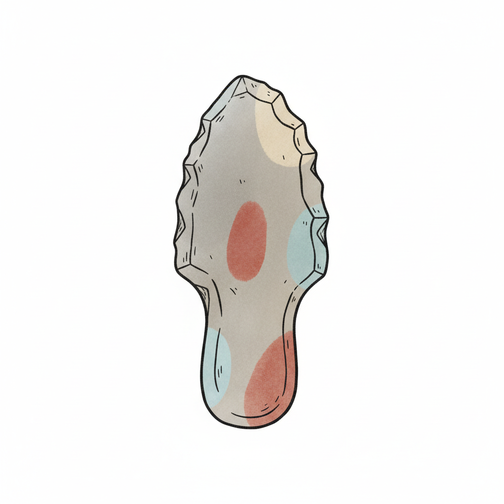 Stilisierte Steinklinge mit gezackten Kanten und farbigen Flecken auf weißem Hintergrund.