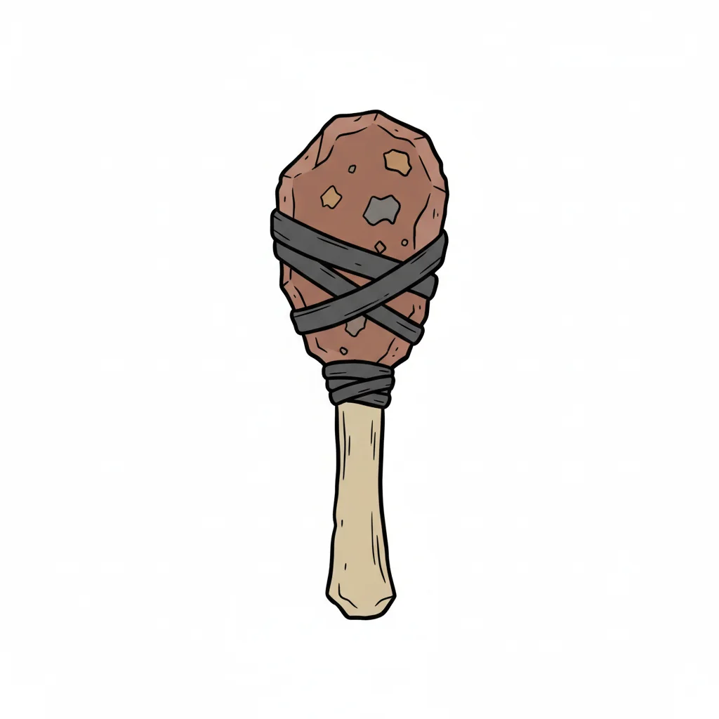 Illustration einer prähistorischen Keule aus Stein und Knochen, mit Bändern umwickelt.