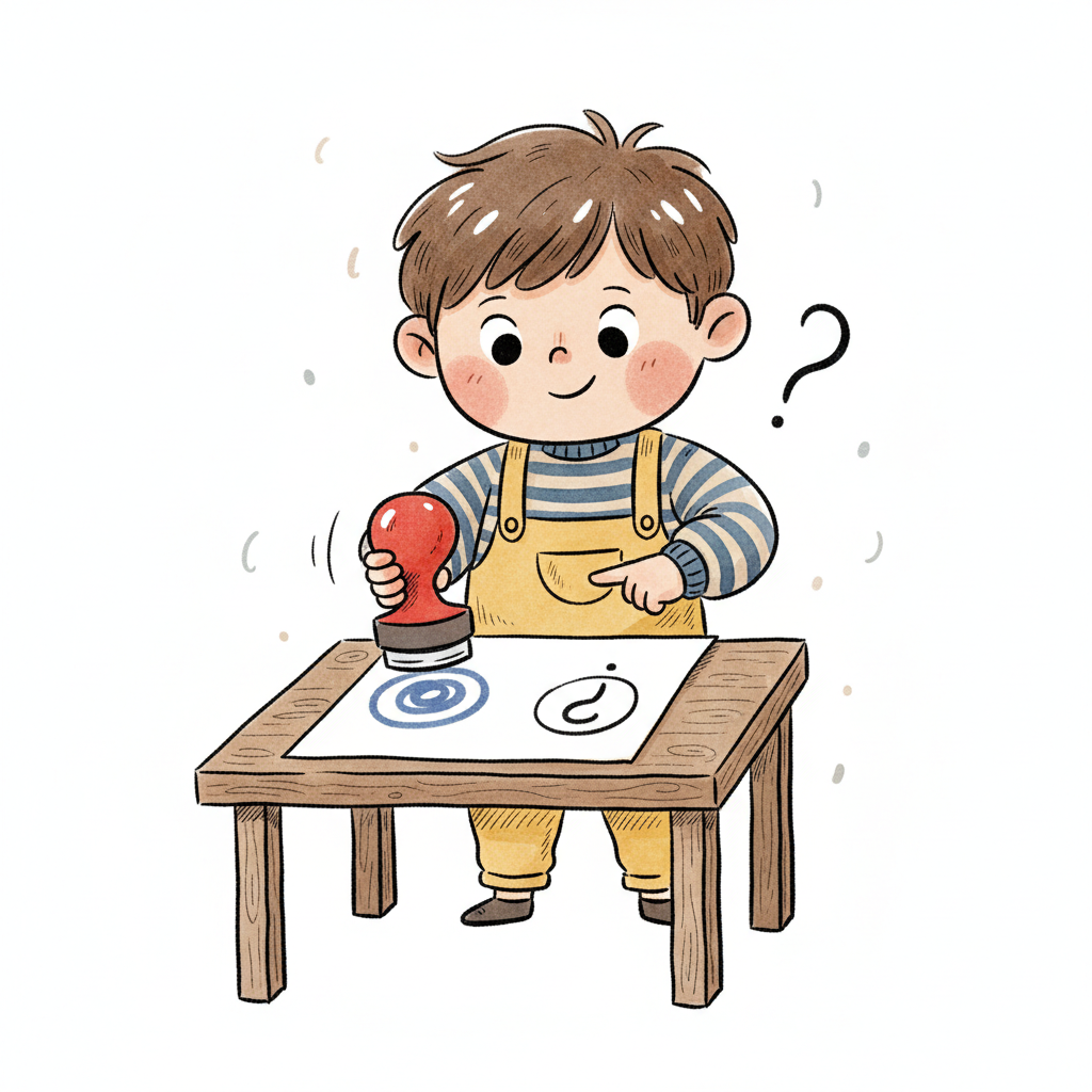 Ein Junge stempelt ein Spiralmuster auf Papier, daneben ein Fragezeichen, er scheint nachzudenken.