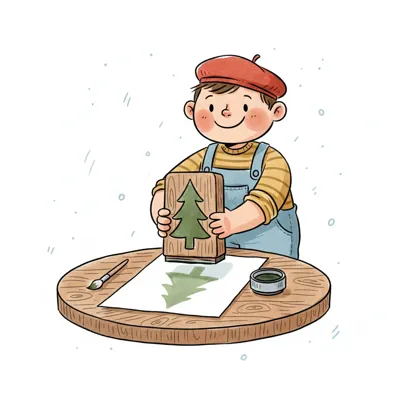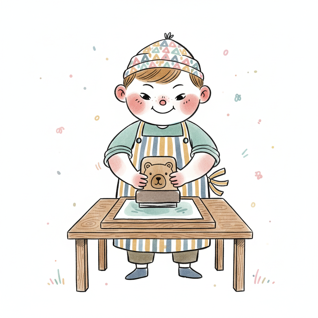 Fröhliches Cartoon-Kind mit Schürze stempelt ein Bärenmotiv auf Papier an einem Holztisch.