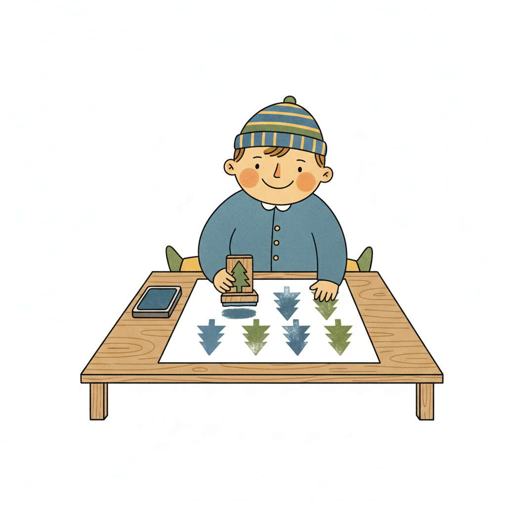 Ein lächelndes Kind stempelt Tannenbäume auf Papier. Es trägt eine Wintermütze und sitzt an einem Tisch.