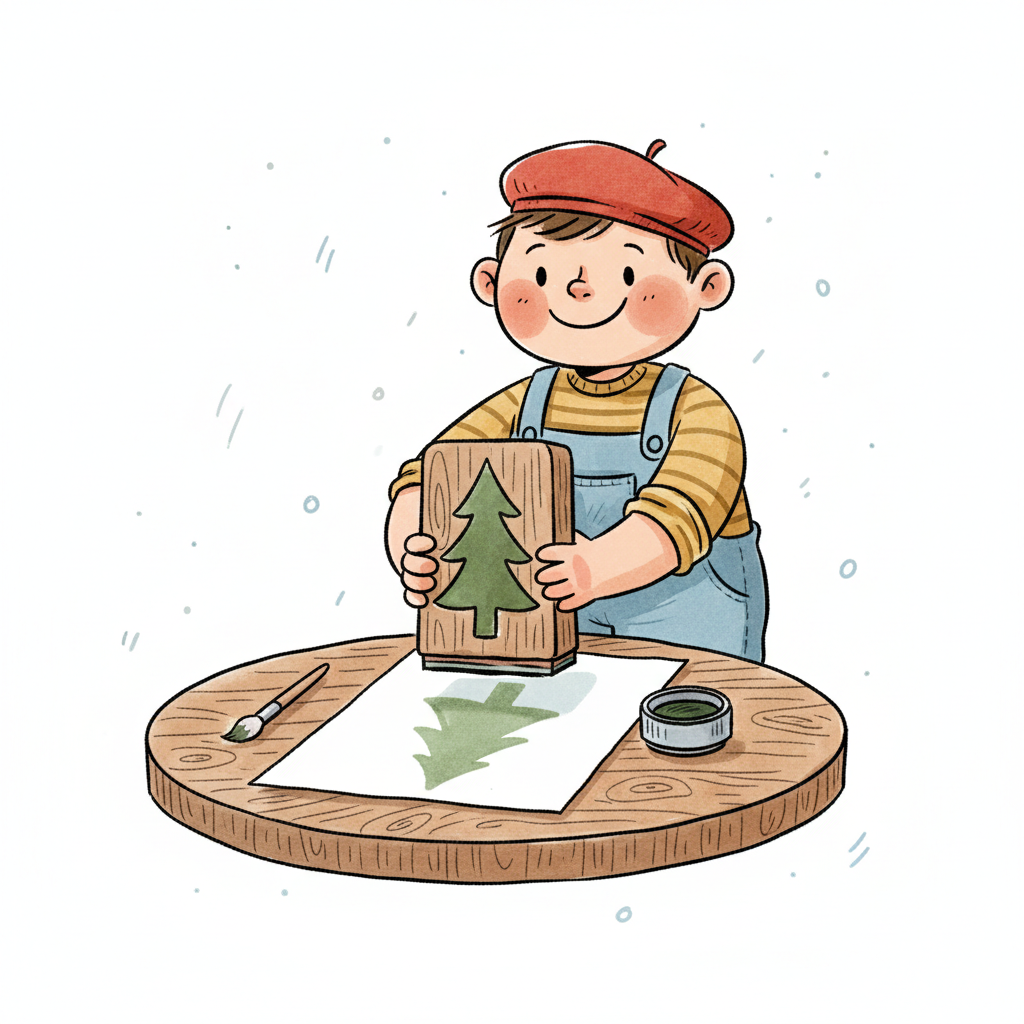Ein Kind stempelt einen Weihnachtsbaum mit einem Holzblock und grüner Farbe auf Papier.