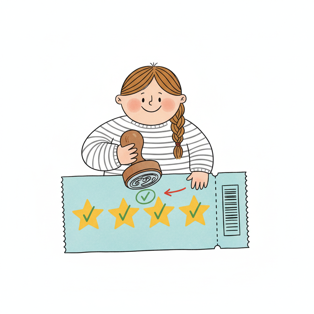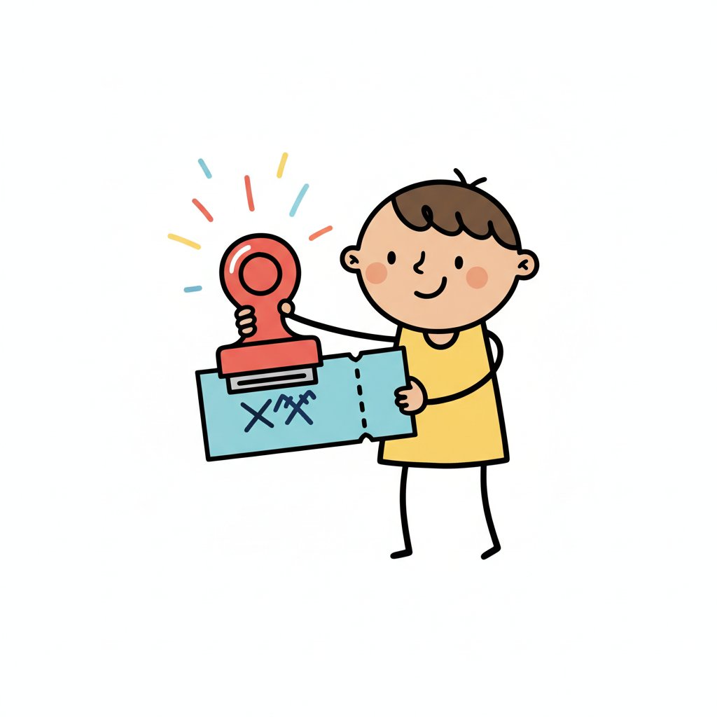 Ein lächelnder Cartoon-Junge stempelt ein blaues Ticket mit einem roten Stempel und 'X's.