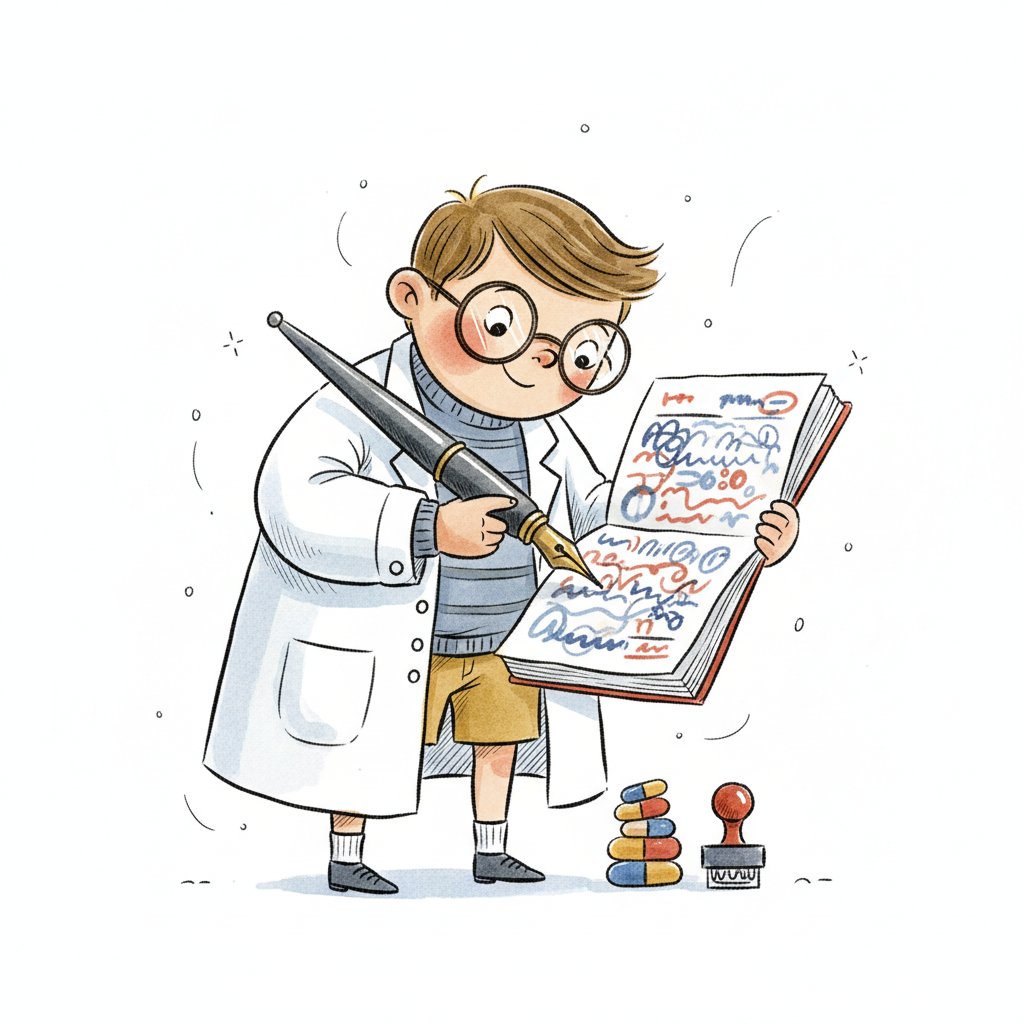 Ein Cartoon-Junge im Laborkittel schreibt mit Füller in ein Notizbuch, daneben Pillen und Stempel.