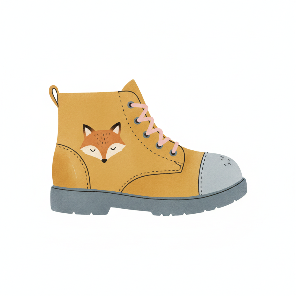Niedlicher gelber Stiefel mit Fuchs-Motiv und pinken Schnürsenkeln.