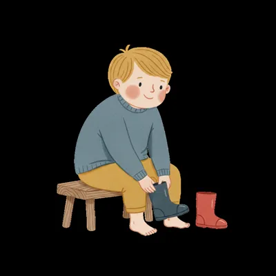 schuhe ausziehen junge gummistiefel spiel nordic-bilderbuch-stil