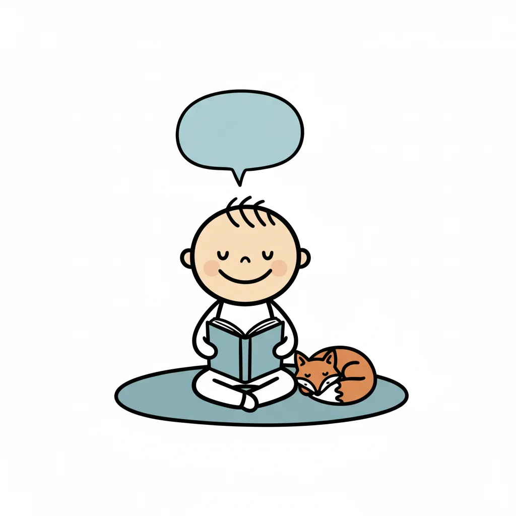 Glückliches Kind liest Buch mit schlafendem Fuchs und Gedankenblase auf blauem Teppich.