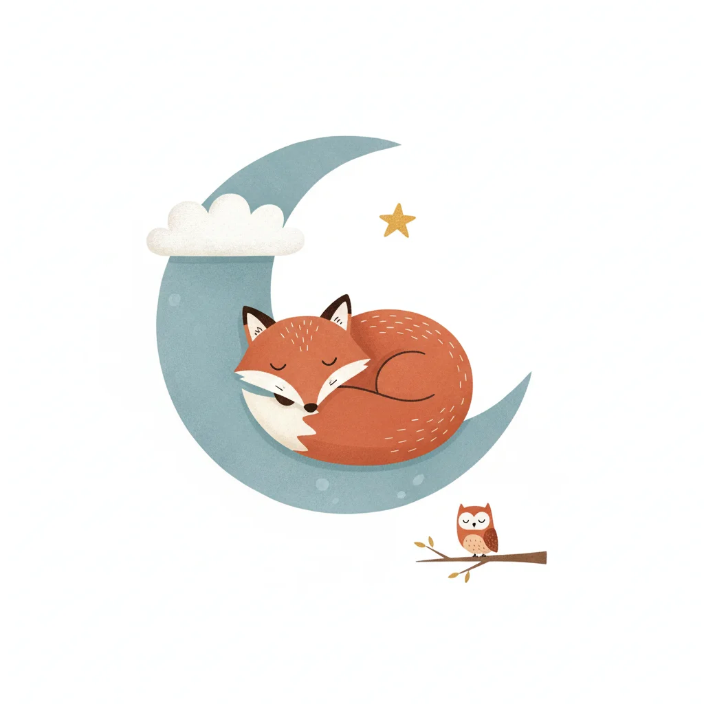 Niedlicher Fuchs schläft auf einem Mond, begleitet von einem Stern und einer Eule auf einem Ast.