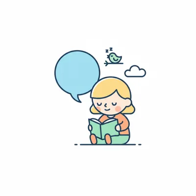 Niedliches Cartoon-Mädchen liest ein Buch, mit einer Sprechblase, einem schlafenden Vogel und einer Wolke.