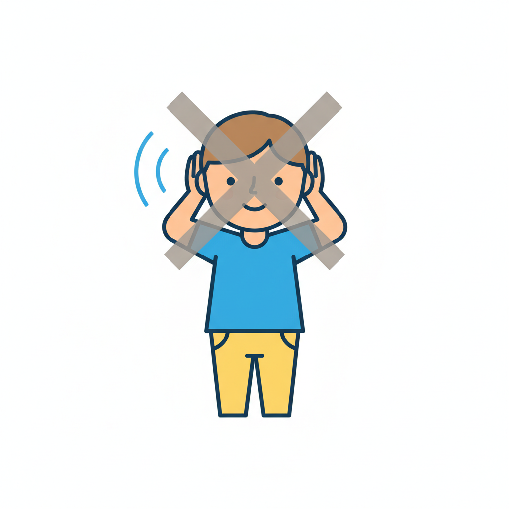 Illustration: Kind hält sich Ohren zu, durchgestrichen, symbolisiert Ruhe oder Lärmverbot.