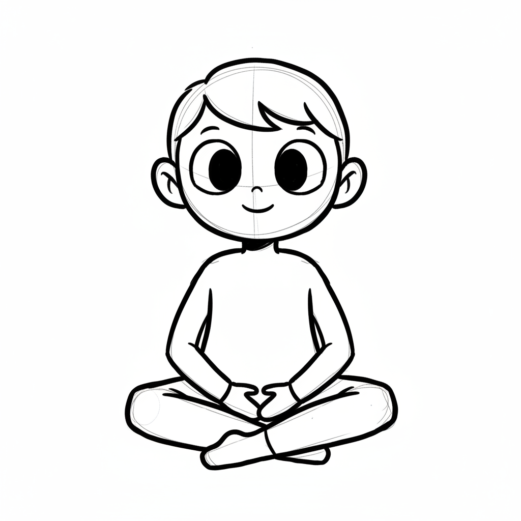 Handgezeichnete Kinderbuchillustration im modernen skandinavisch-nordischen Stil. Minimalistische, freundliche Figur mit einfachen Formen und leicht unregelmäßigen, handgezeichneten Linien. Ruhige, gedeckte Farbpalette, viel freie Fläche, reduzierte Details, sanfte Papier- oder Aquarellstruktur. Warme, ruhige, leicht humorvolle Stimmung, flächige Komposition ohne starke Perspektive, moderner nordischer Illustrationsstil, charmant und zeitlos.