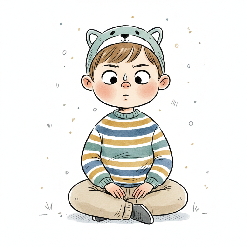 Ein nachdenklicher Junge in gestreiftem Pullover und Tiermütze sitzt auf dem Boden.