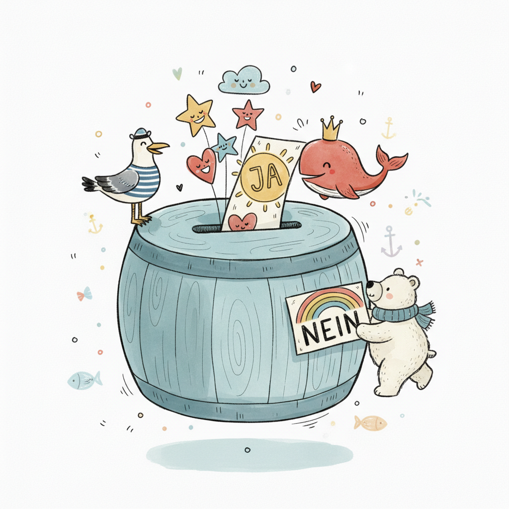 Niedliche Tiere stimmen ab: Ja-Karte im Fass, Bär hält Nein-Schild mit Regenbogen.