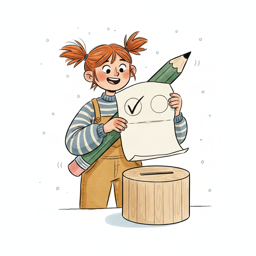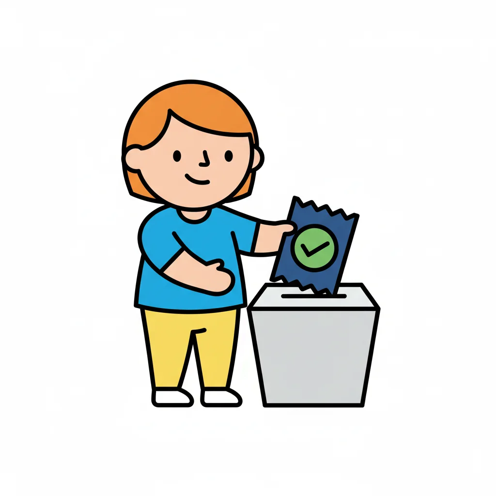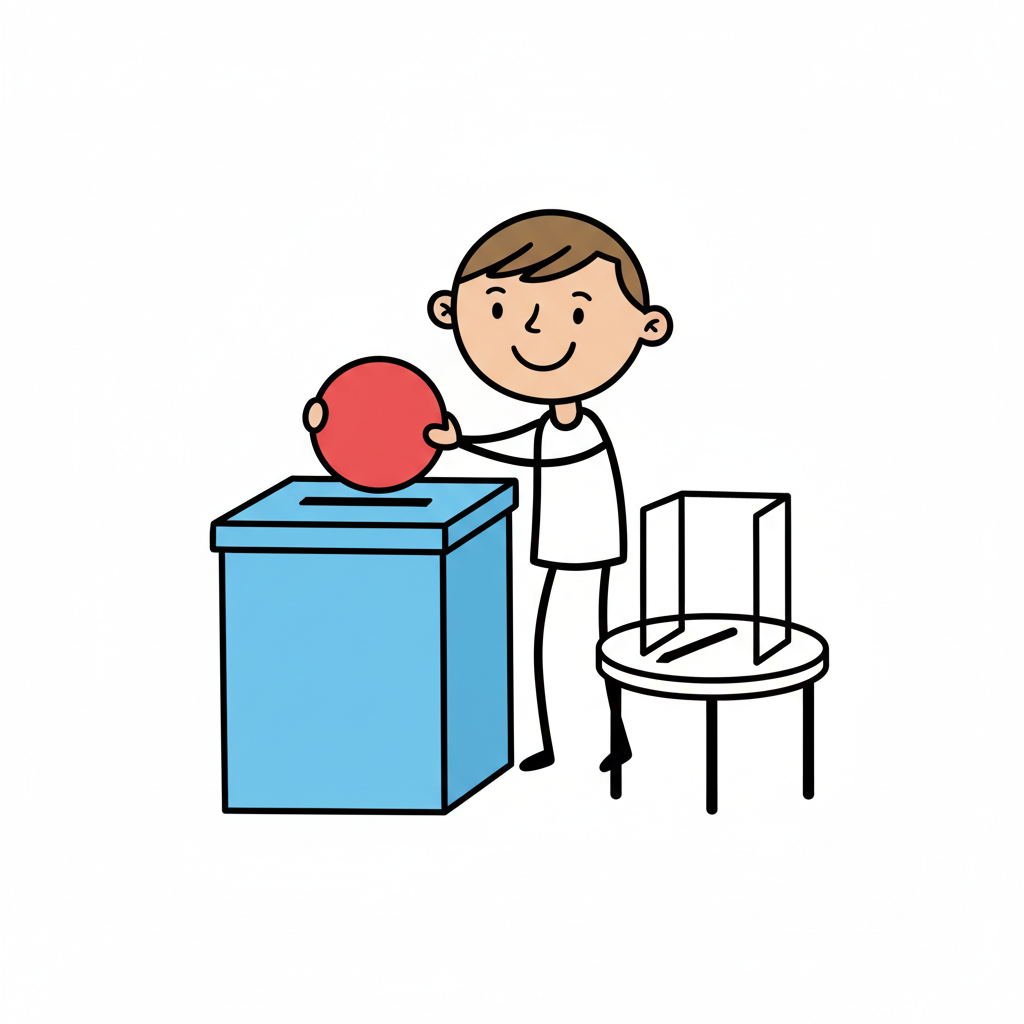 Ein lächelnder Cartoon-Charakter wirft einen roten Ball in eine blaue Wahlurne.