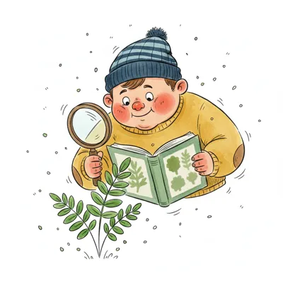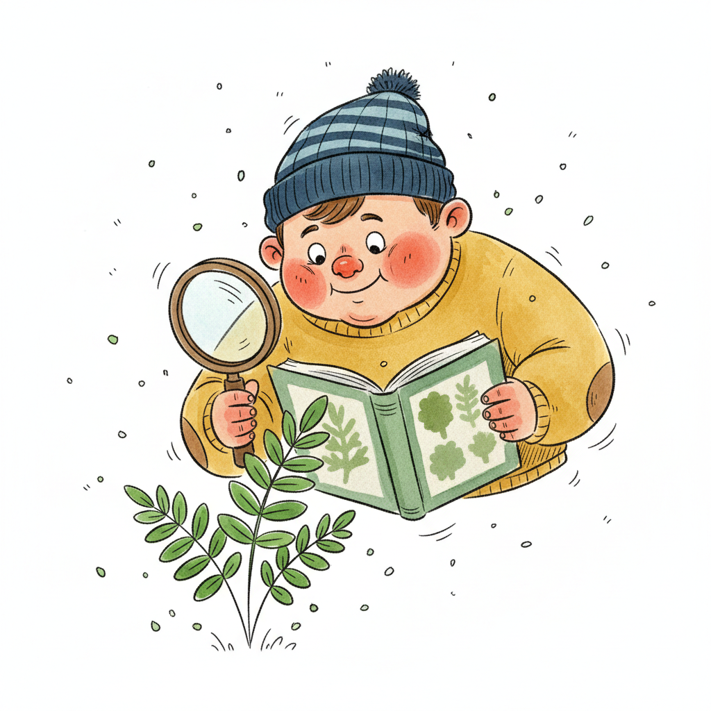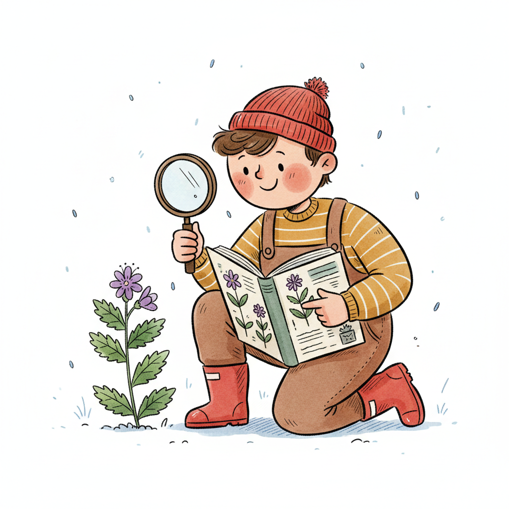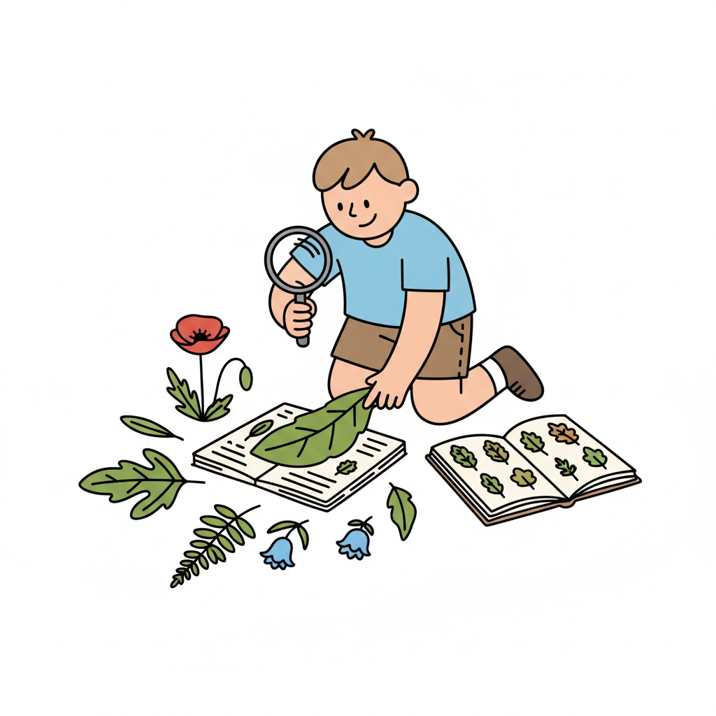 Junge erforscht Pflanzen mit Lupe und Büchern, umgeben von Blättern und Blumen.