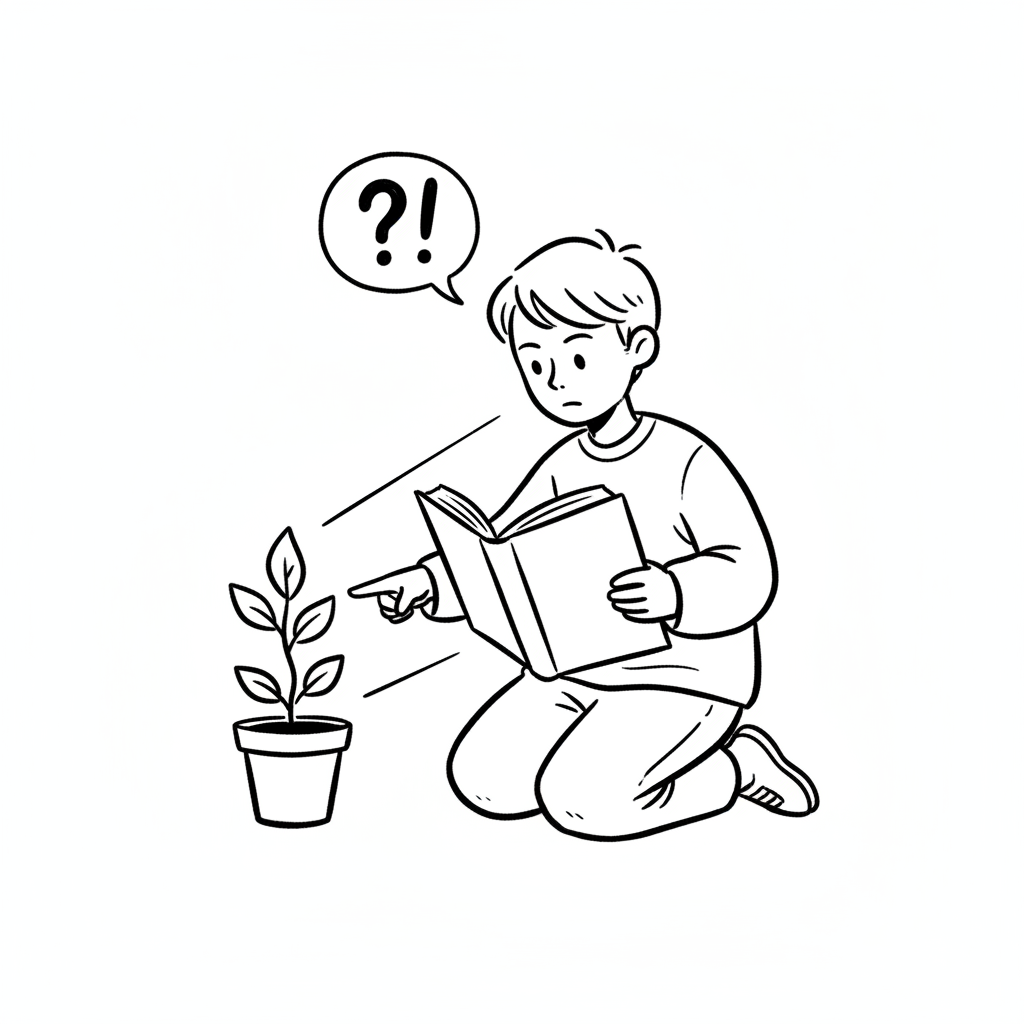 Junge liest Buch, zeigt auf Pflanze, fragt sich etwas. Neugier, Lernen, Natur.