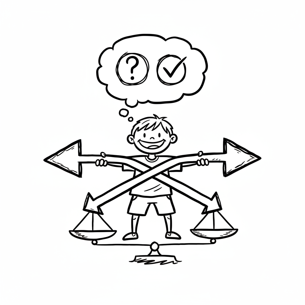 Junge auf Waage, hält gekreuzte Pfeile, denkt über Fragezeichen/Häkchen nach. Symbolisiert Entscheidung.