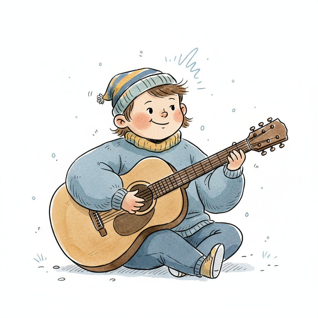 Fröhliches Kind in warmer Winterkleidung spielt Akustikgitarre. Niedliche Aquarell-Illustration.