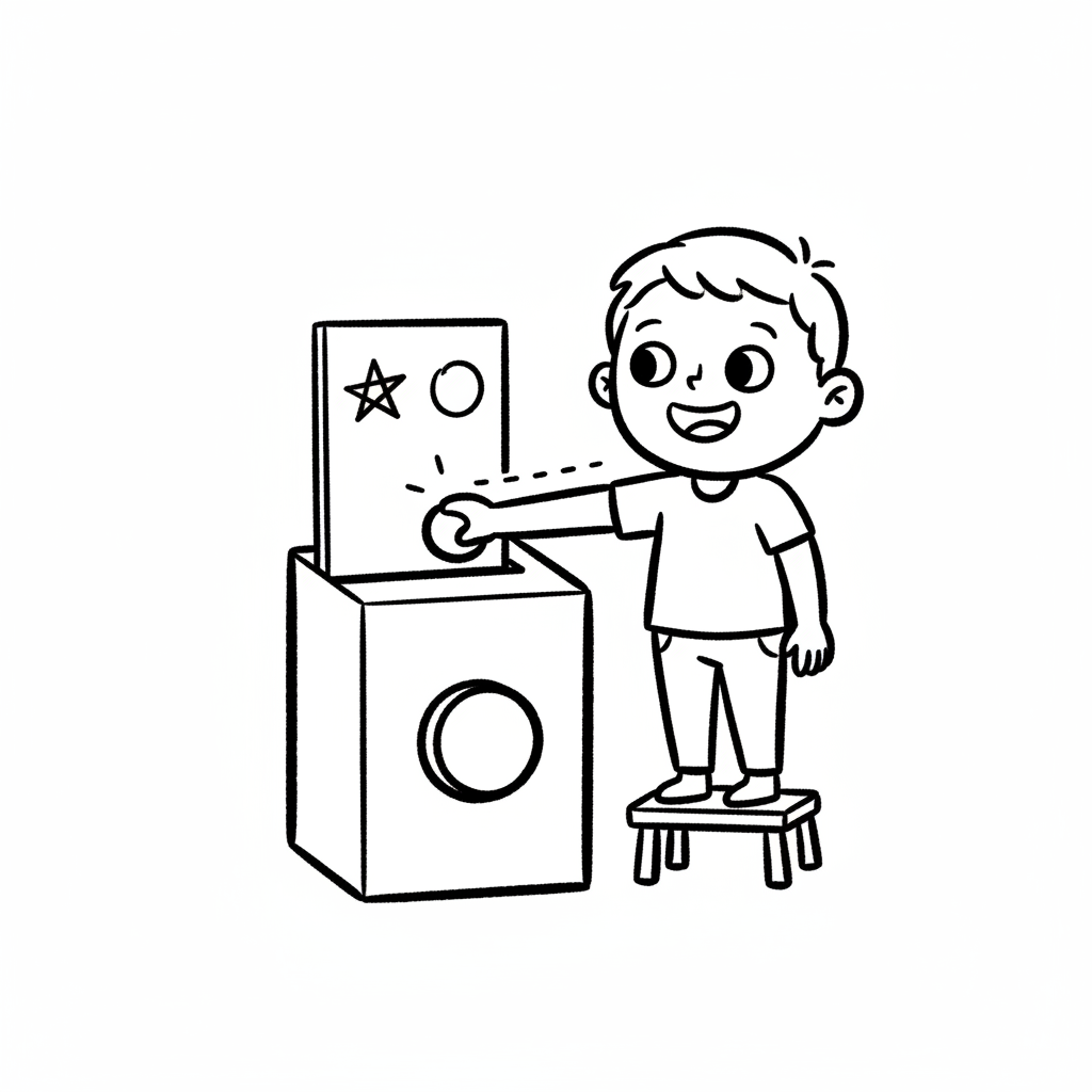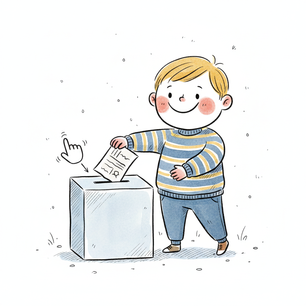 Ein lächelnder Cartoon-Junge steckt einen Zettel in eine Wahlurne, mit einem Klick-Symbol.