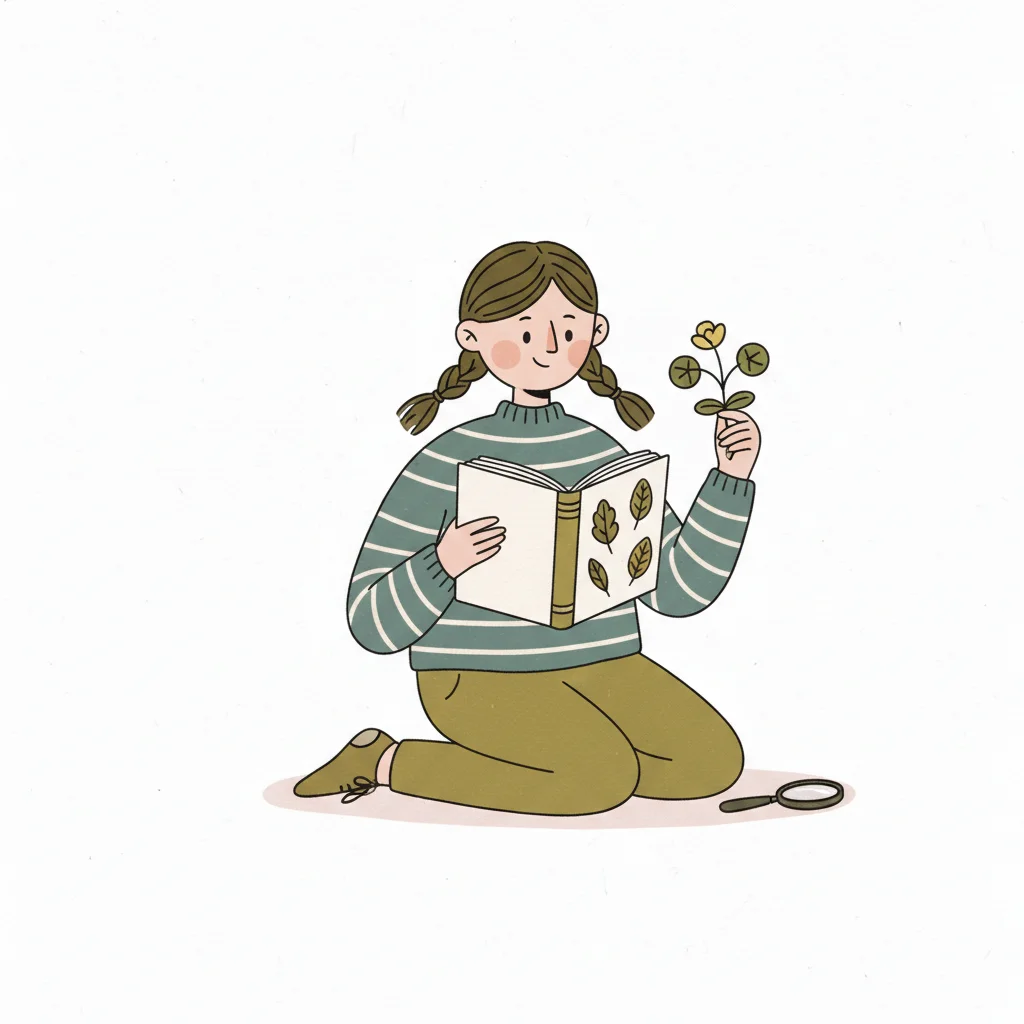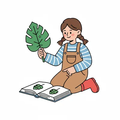 Mädchen mit Zöpfen vergleicht ein großes Blatt mit Abbildungen in einem Botanikbuch.