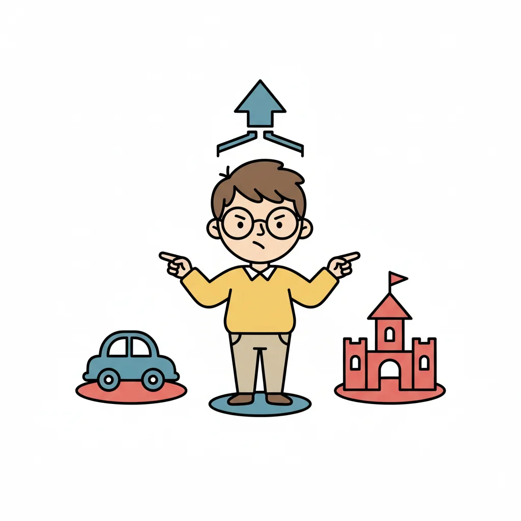 Ein Junge mit Brille steht unentschlossen zwischen einem Auto und einer Burg, symbolisiert eine Wahl.