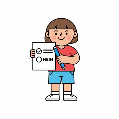 Ein lächelndes Kind hält einen Stimmzettel mit einer Ja-Option (angekreuzt) und einer Nein-Option.