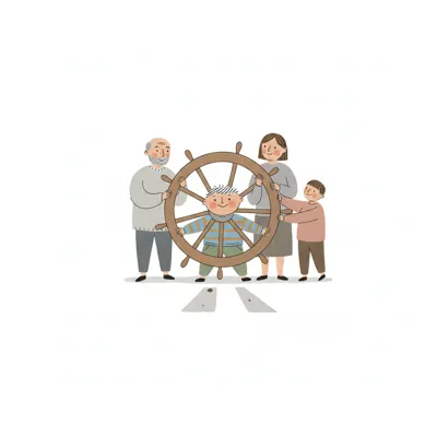 Familie unterstützt Kind am Steuerrad, symbolisiert Führung und Zusammenhalt der Generationen.