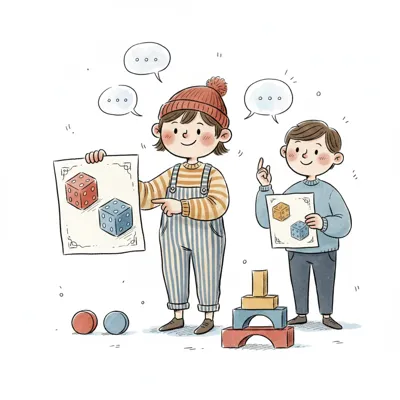 Kinder präsentieren Würfelbilder und diskutieren spielerisch.