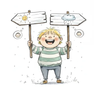 Fröhliches Kind hält Schilder für Sonne und Regen, symbolisiert Stimmungen oder Entscheidungen.