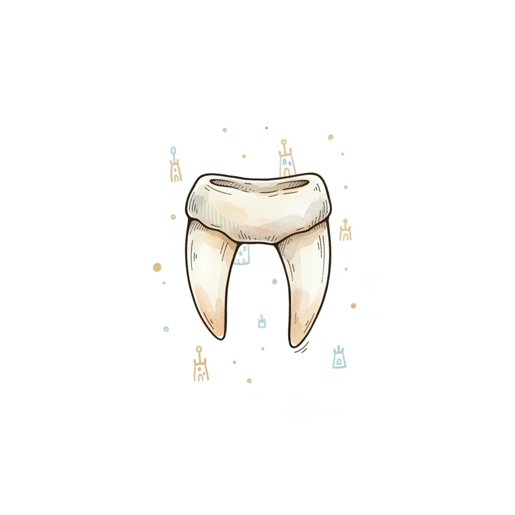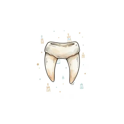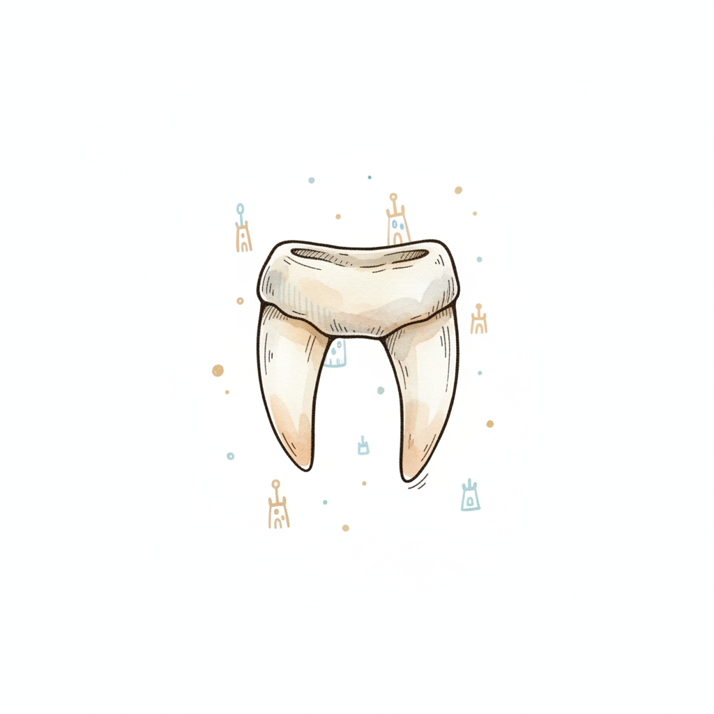 Stilisierter, beiger Zahn mit zwei Wurzeln in Aquarelloptik auf weißem Grund mit kleinen Symbolen.