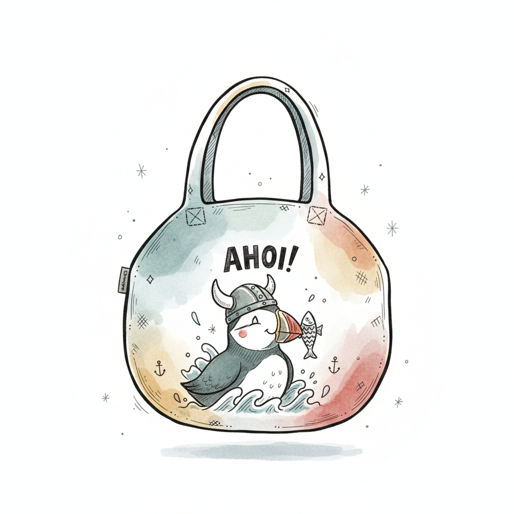 Bunte Tasche mit einem Wikinger-Papageientaucher, der einen Fisch hält und "AHOI!" ruft.
