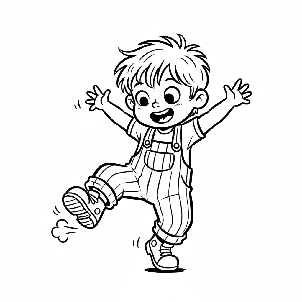 Junger Junge in Latzhose, der fröhlich mit einem Fuß springt.