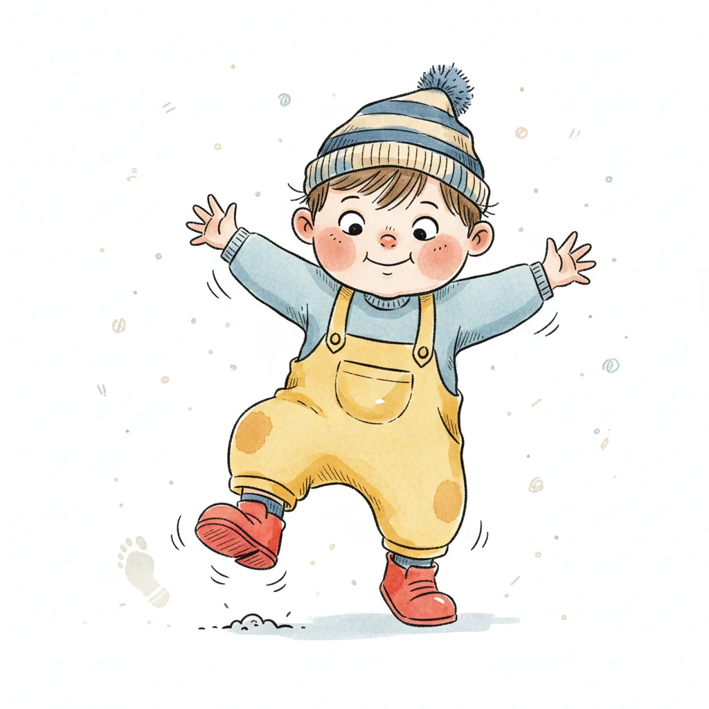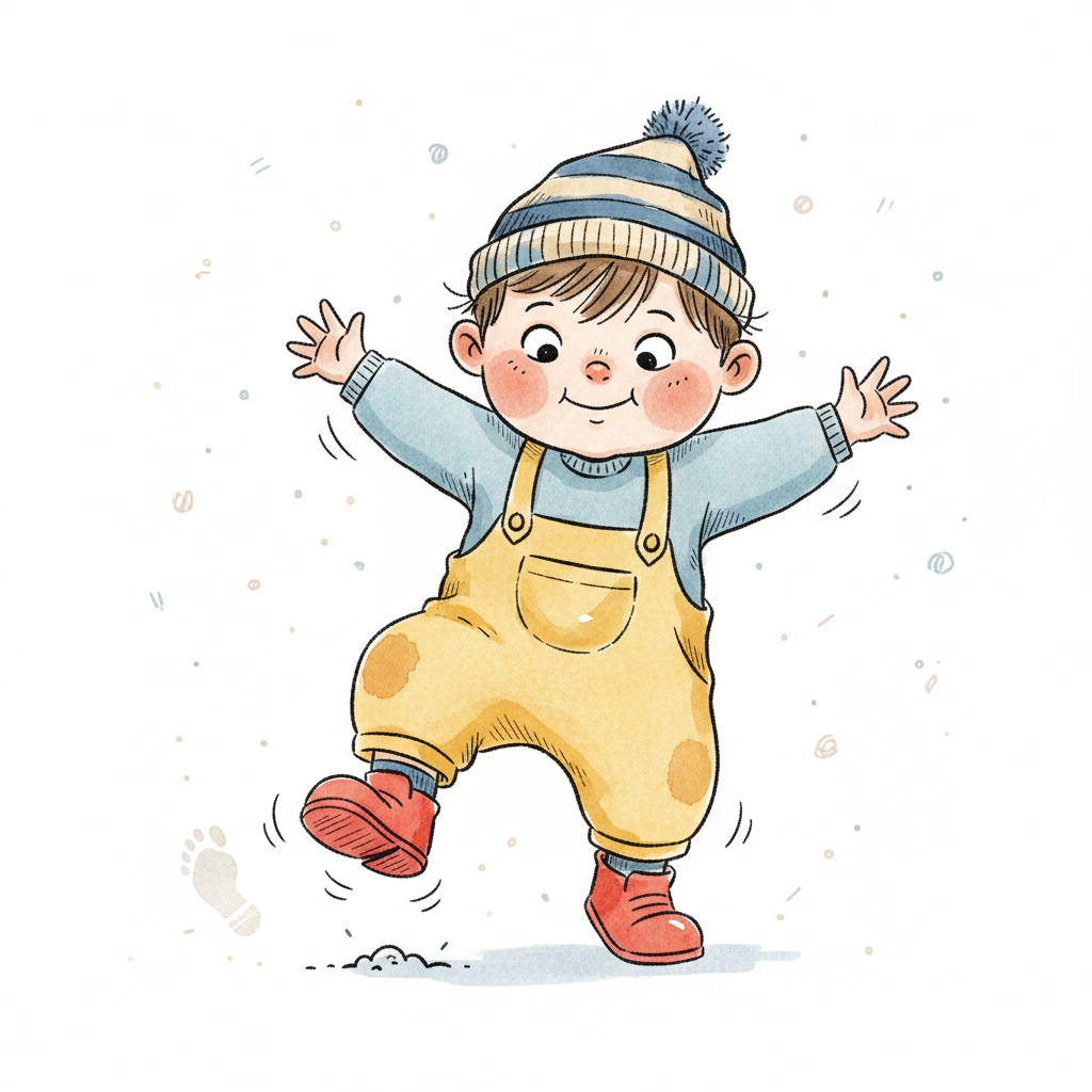 Ein fröhlicher Junge in gelben Latzhosen und Mütze springt im Schnee.