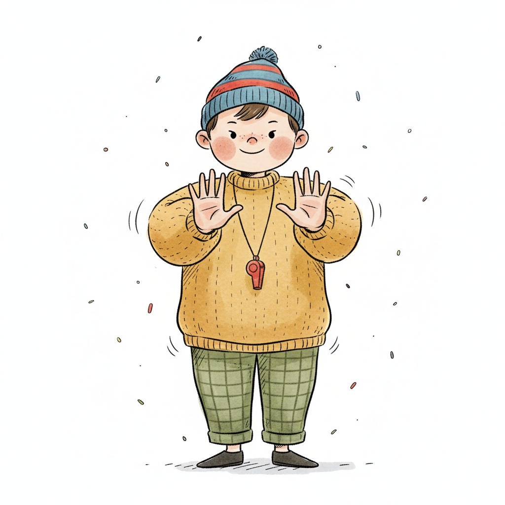 Niedlicher Cartoon-Junge mit Mütze und Trillerpfeife, Hände zum Stoppen erhoben.