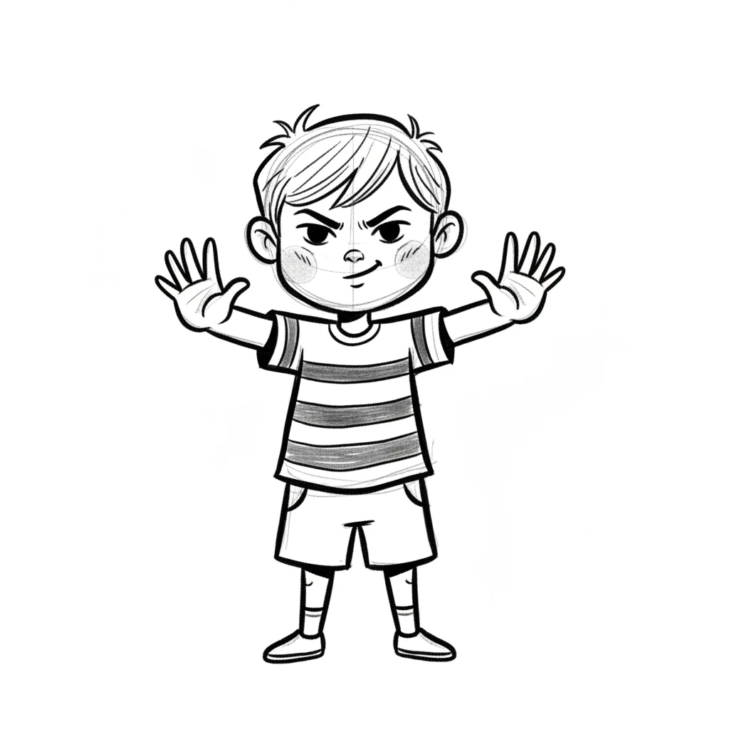Cartoon-Junge mit wütendem Gesichtsausdruck und erhobenen Händen, die 'Stopp' signalisieren.