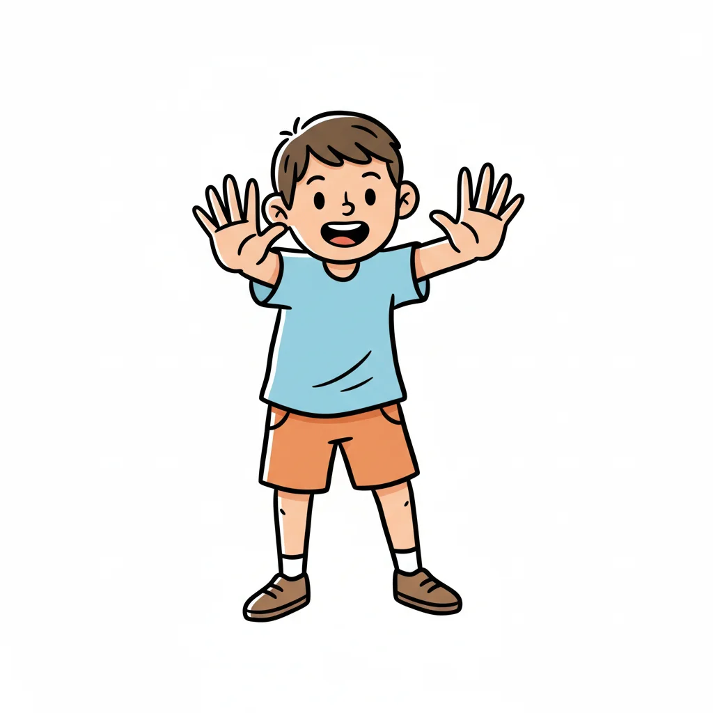 Fröhlicher Cartoon-Junge mit braunen Haaren, blauem Shirt und orangefarbenen Shorts, Hände erhoben.